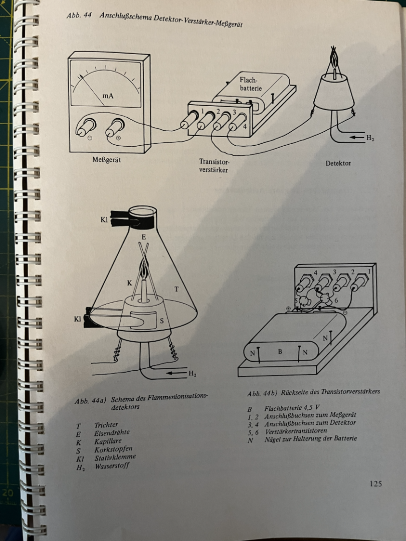 Apropos: Ich habe vor Kurzem beim Aufräumen das Buch "Laborbücher Chemie - Gaschromatographie" von Adalbert Wollrab, Ausgabe 1982, wieder gefunden. Darin wird auch der Eigenbau eines Flammenionisationsdetektors (Wasserstoff) mit Transistorverstärker ( :yeah: ) beschrieben. Überhaupt ein gutes Buch für denjenigen, der sich mit dem Selbstbau von Gaschromatographen beschäftigt.